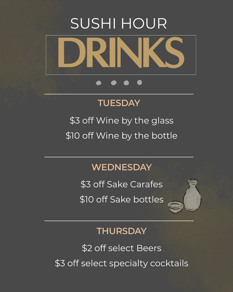 Join us Tuesday through Thursday for Sushi Hour, featuring exclusive rolls, chef-curated bites, and drink specials designed to elevate your early evening.